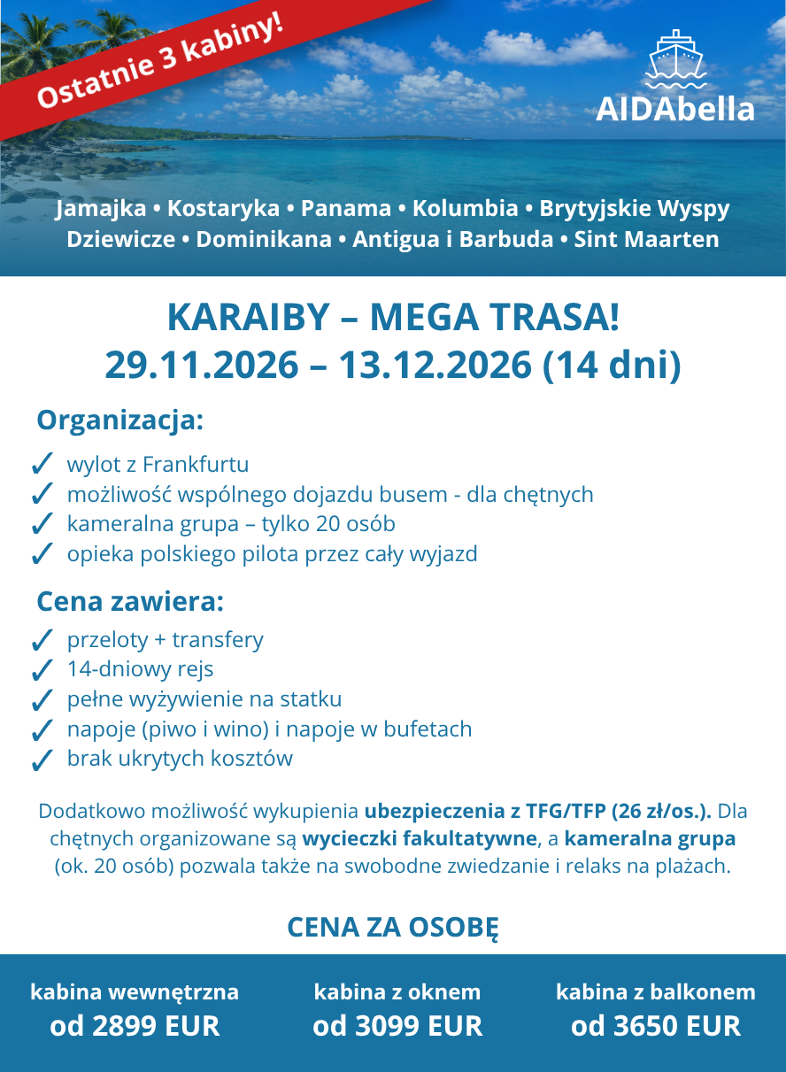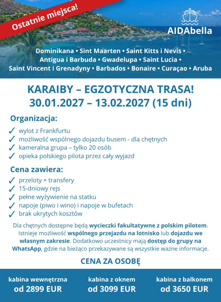 Rejsy grupowe to idealna propozycja dla osób, które chcą podróżować wygodnie, bez stresu i w świetnym towarzystwie. Zapewniamy kompleksową organizację, wsparcie na każdym etapie wyjazdu oraz starannie dobrane trasy, które pozwalają zobaczyć najpiękniejsze miejsca świata. Kameralna atmosfera sprzyja integracji, a jednocześnie daje swobodę odkrywania – możesz korzystać ze wspólnych atrakcji lub zwiedzać we własnym tempie. To połączenie komfortu, bezpieczeństwa i niezapomnianych wrażeń, które sprawia, że każdy rejs staje się wyjątkowym doświadczeniem.
