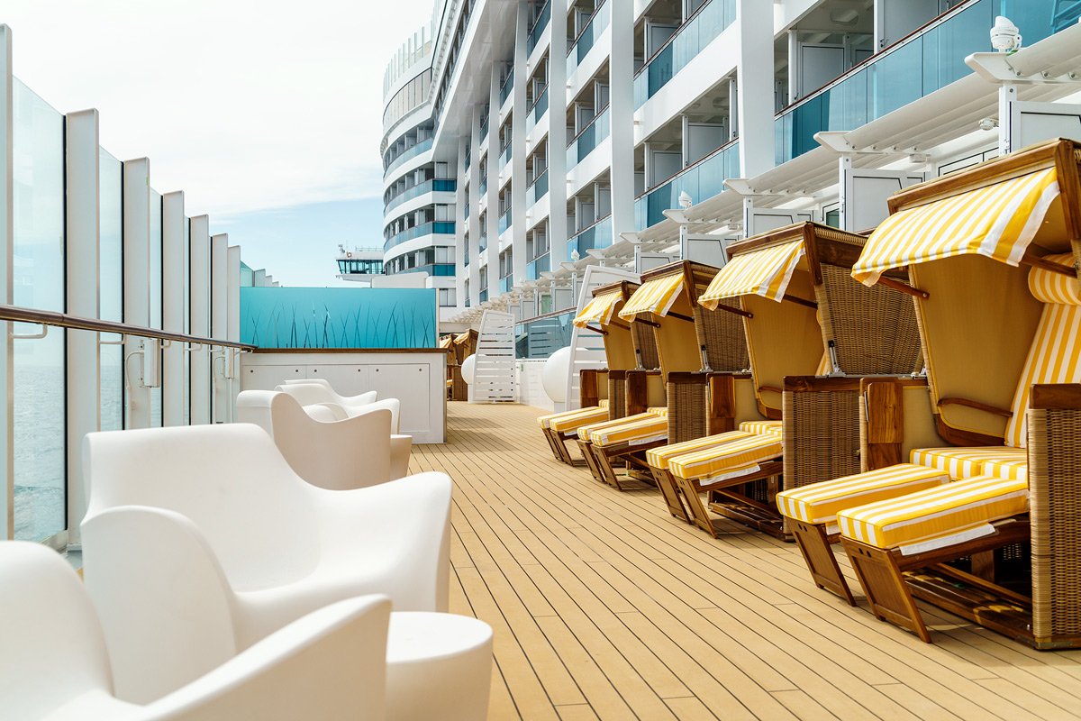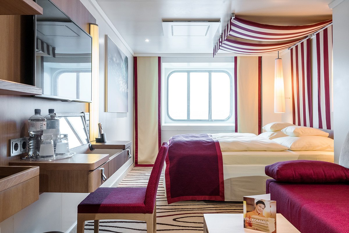 Powierzchnia ok. 24 – 37m², w tym balkon (ok. 4 – 16 m2) z zestawem wypoczynkowym. Wyposażenie: dwa łóżka (możliwość zestawienia), łazienka z prysznicem i WC, garderoba, toaletka, część dzienna, TV, DVD, telefon, sejf, suszarka do włosów, ręczniki basenowe, szlafroki. Część kabin z rozkładanymi łóżkami dla 3 i 4 osoby.