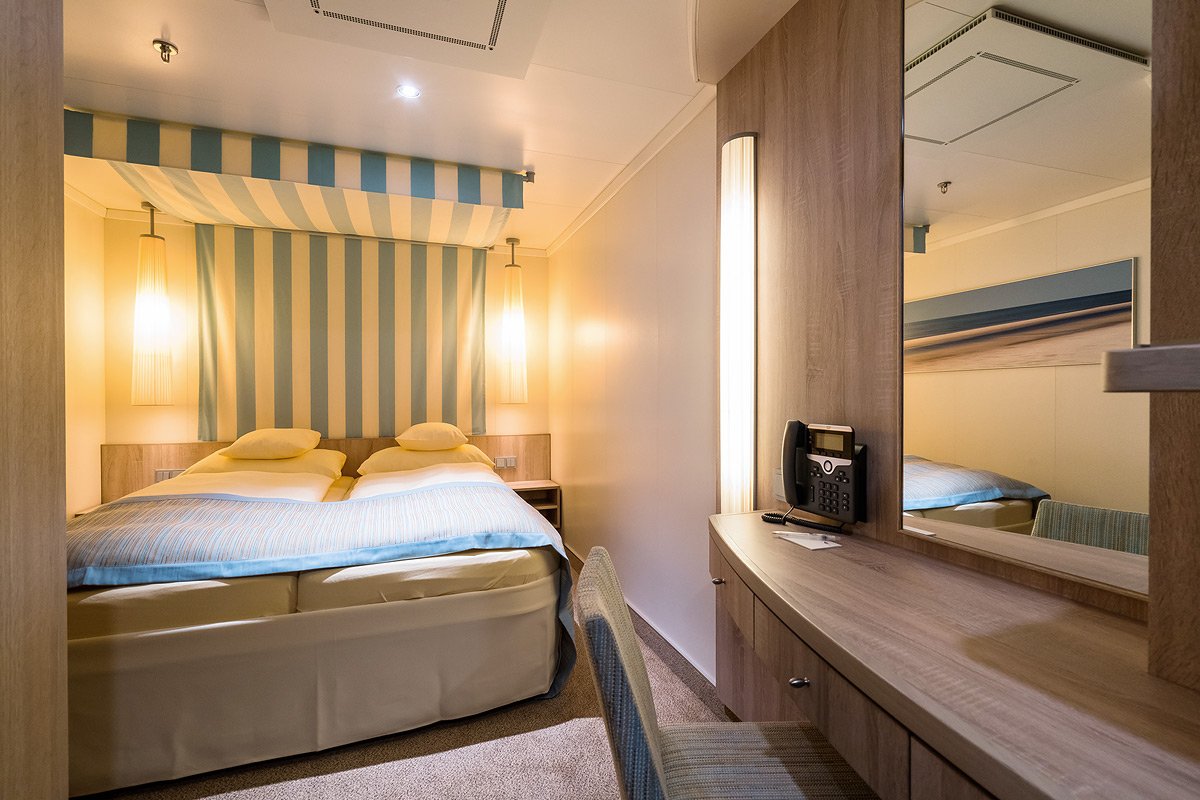 Powierzchnia ok. 22 – 23m² (kabina dla niepełnosprawnych o powierzchni 27 – 28m²). Wyposażenie: dwa łóżka (możliwość zestawienia), łazienka z prysznicem i WC, garderoba, toaletka, część dzienna, TV, DVD, telefon, sejf, suszarka do włosów, ręczniki basenowe, szlafroki. Część kabin z rozkładanymi łóżkami dla 3 i 4 osoby.