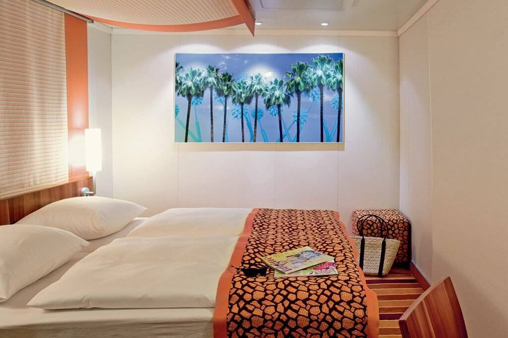 Przytulna kabina o powierzchni ok. 13,5 m², wyposażona w dwa łóżka z możliwością zestawienia, łazienkę z prysznicem i WC, garderobę, część dzienną oraz toaletkę.