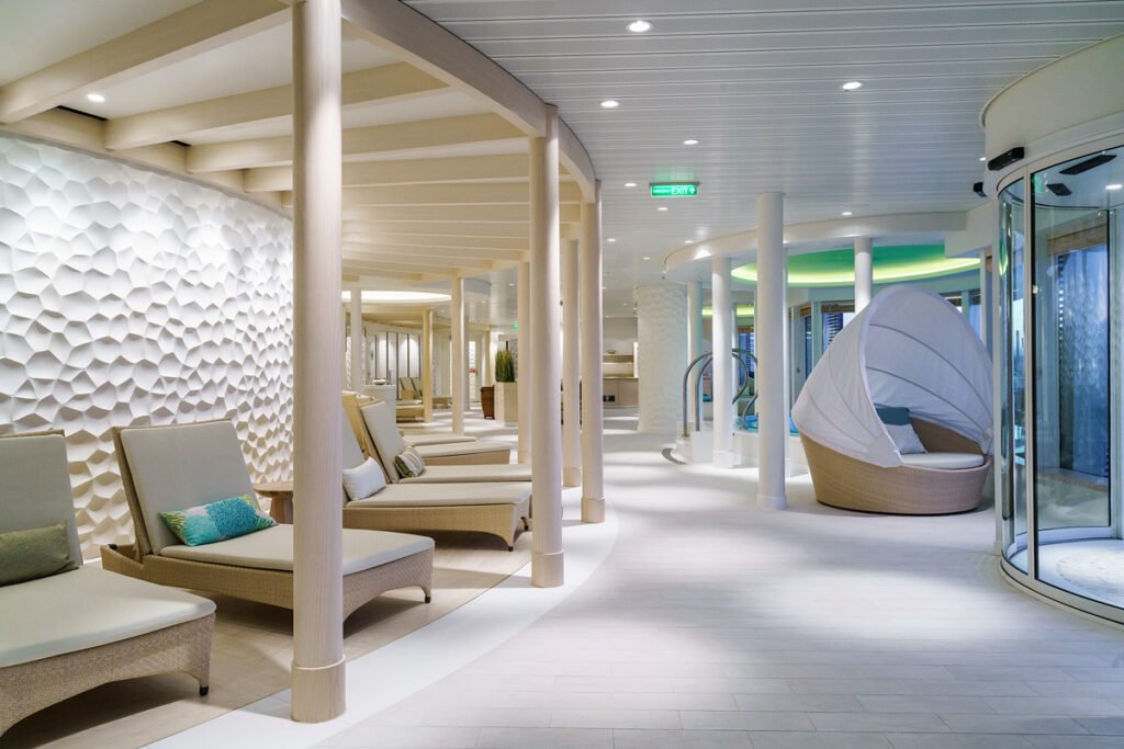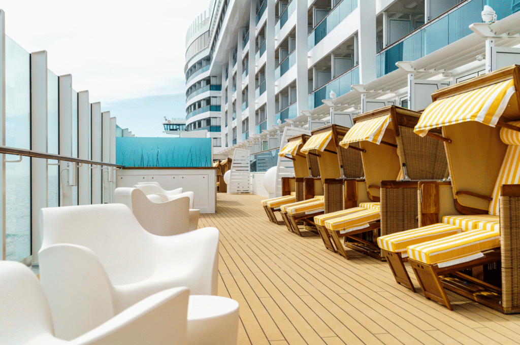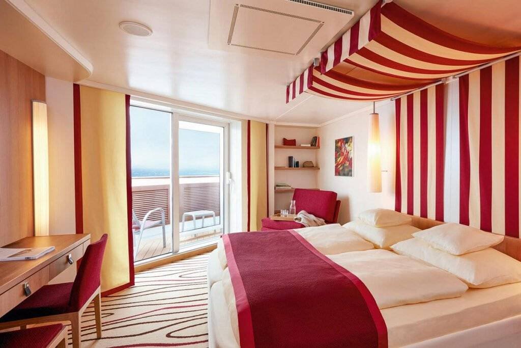 Powierzchnia 21–27 m², dla 2–4 osób, balkon ok. 6 m² z zestawem wypoczynkowym. Wyposażenie jak w kabinie z oknem, dodatkowo część dzienna i przestrzeń na świeżym powietrzu. Idealna do relaksu i obserwowania morza z prywatnego balkonu.