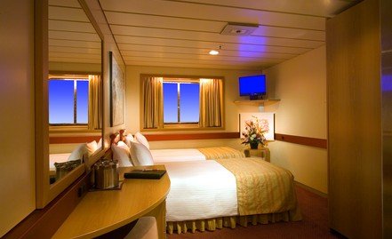 Przytulna kabina z iluminatorem w kształcie bulaja. Łączy przystępną cenę z możliwością podziwiania oceanu bez wychodzenia z kajuty.