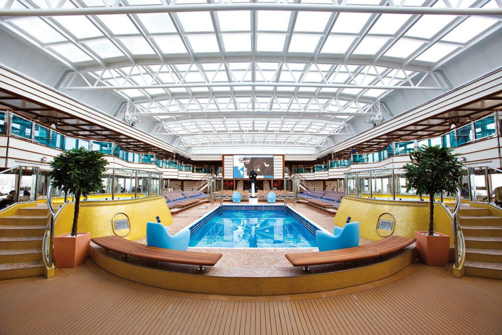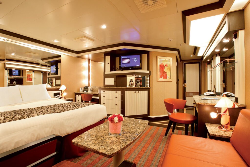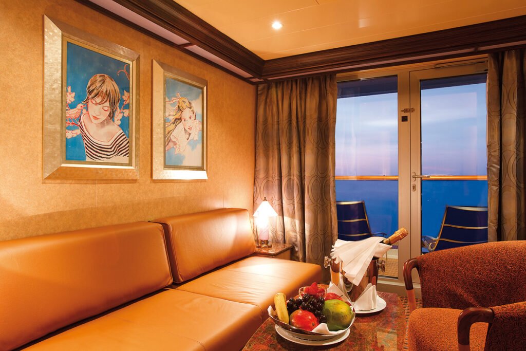 Przestronna kabina o powierzchni 20–24 m² z prywatnym balkonem, wyposażona w podwójne łóżko lub dwa pojedyncze, łazienkę z prysznicem lub wanną, a także TV, radio, telefon, sejf, minibar oraz klimatyzację – zapewniając wygodę i pełen komfort podczas rejsu.