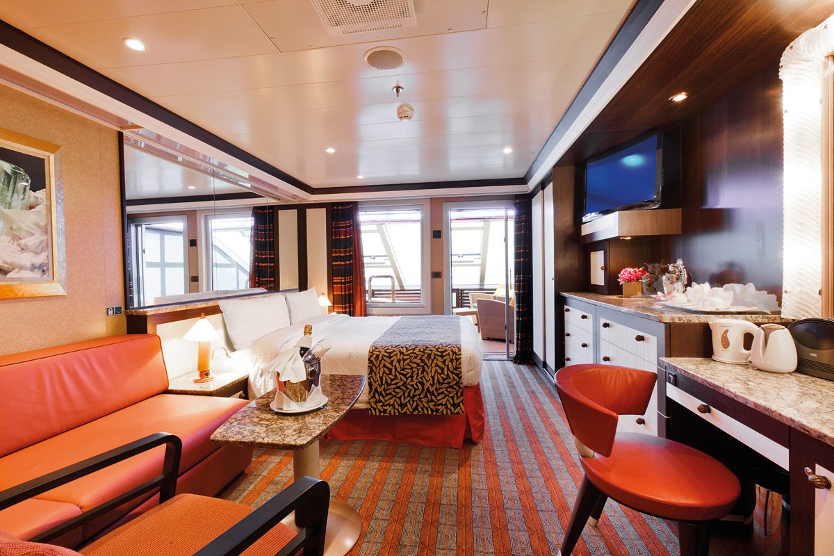 Komfortowa kabina o powierzchni ok. 20 m², wyposażona w duże okno balkonowe i prywatny balkon, dwa pojedyncze łóżka z możliwością połączenia, szafę oraz łazienkę z prysznicem. Do dyspozycji gości jest także część wypoczynkowa z biurkiem.
