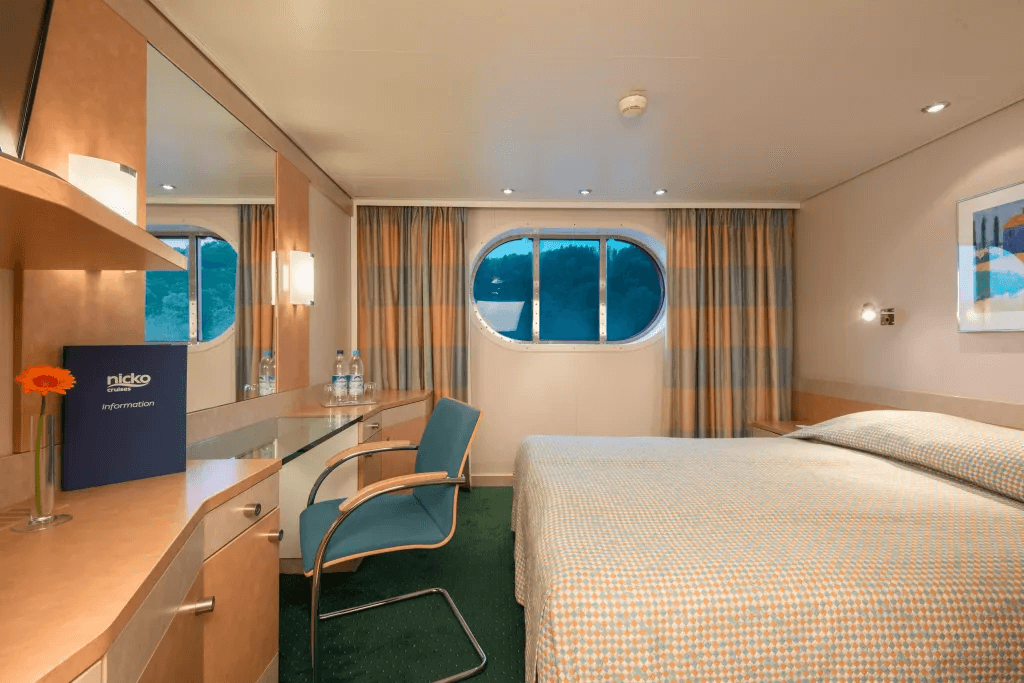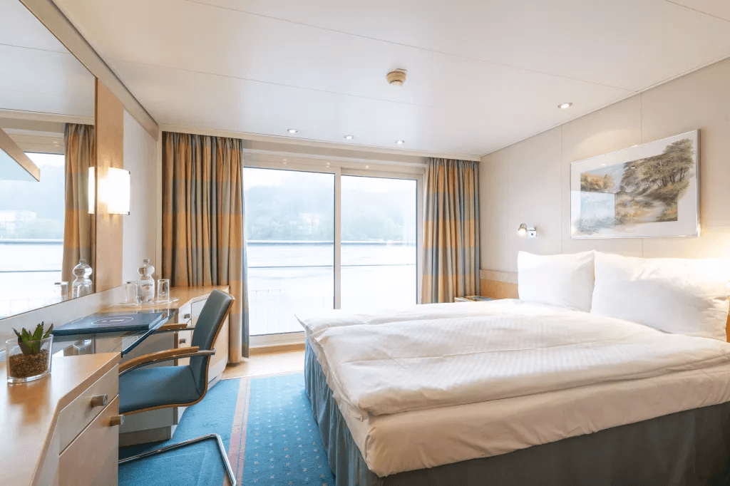 Komfortowa kabina o powierzchni 16 m², wyposażona w duże okno, podwójne łóżko z możliwością rozdzielenia na dwa pojedyncze, luksusową pościel, stoliki nocne, lampki do czytania, szafę oraz biurko z lustrem i fotelem.