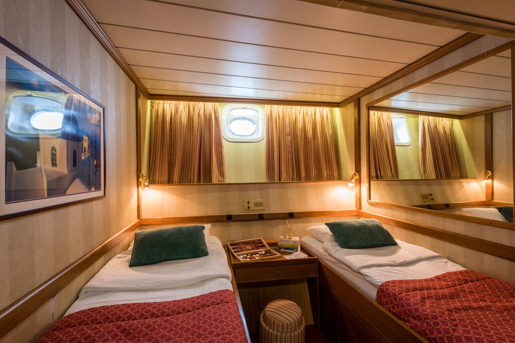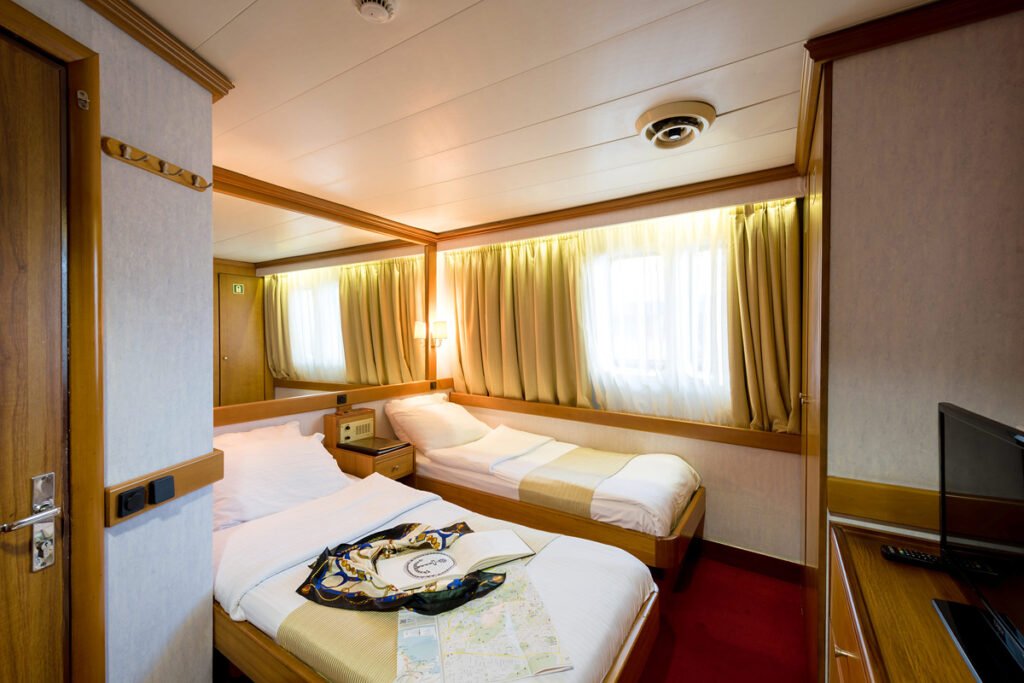 Na statku znajduje się 25 wygodnych kabin, rozmieszczonych na pokładzie Marina, Głównym i Górnym. Wszystkie są zewnętrzne i oferują naturalne światło dzięki oknom lub bulajom.
